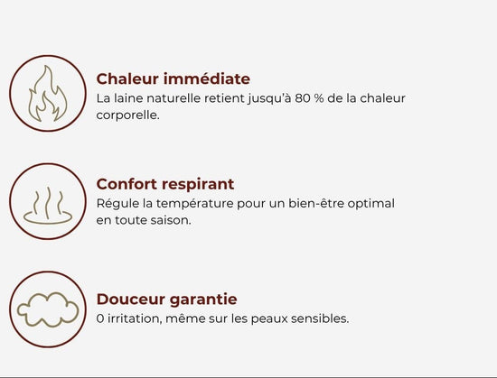 Oui. La laine australienne précieuse a été exclusivement choisie, réputée pour être plus fine et plus souple que la laine traditionnelle. Sa texture unique lui confère une douceur exceptionnelle qui ne gratte pas et reste agréable même directement sur la peau. Vous profitez ainsi de tout le confort et de la chaleur de la laine, sans les désagréments.